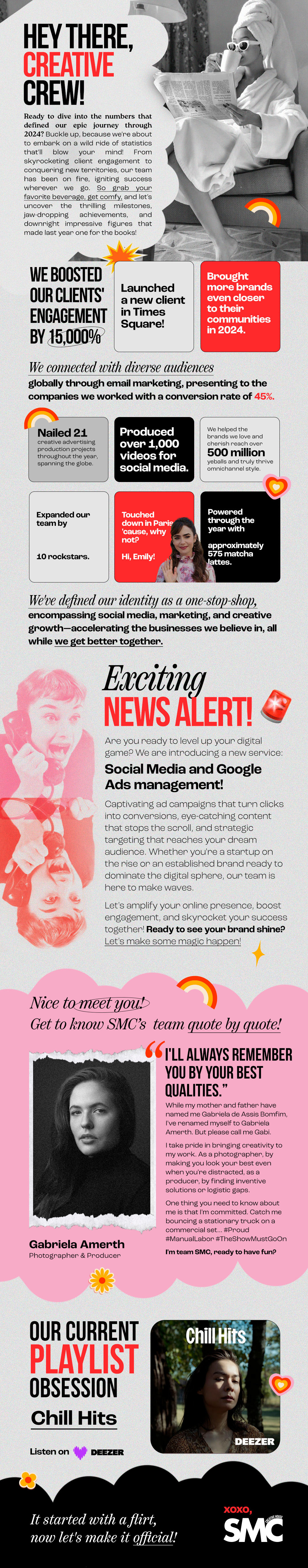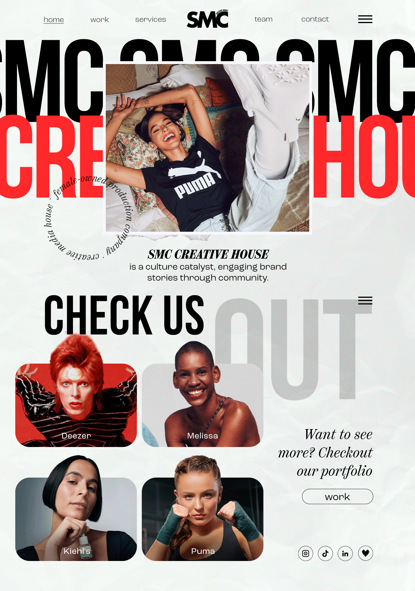 Projects for SMC Creative House: Website UI Design, Newsletter Layout, and Social Media Posts.